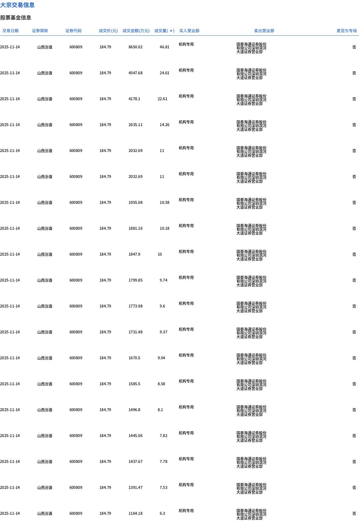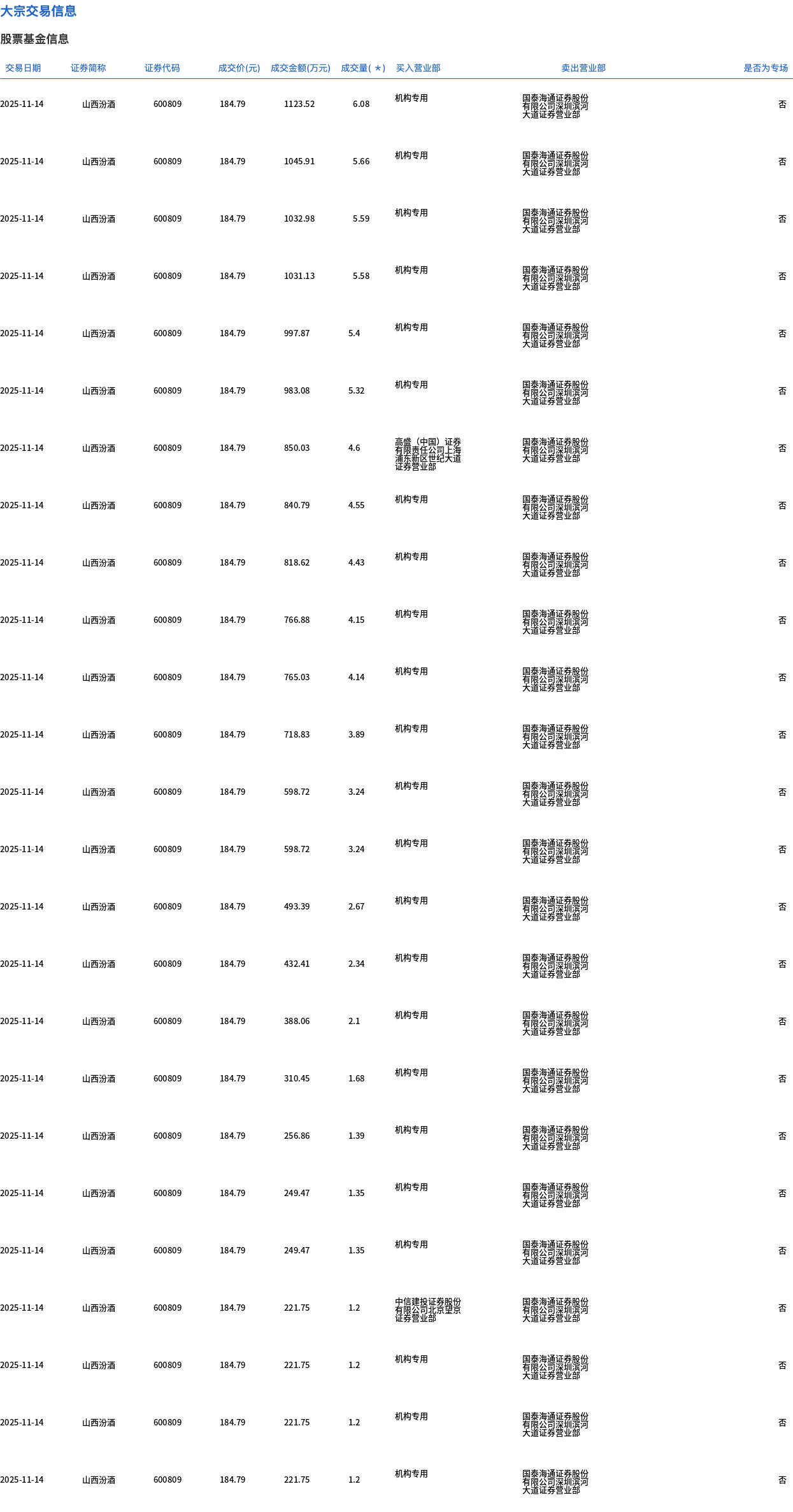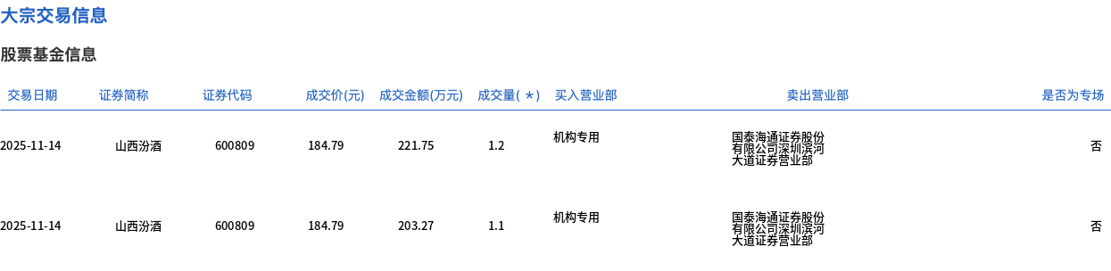 11月14日,山西汾酒大宗交易成交330.76万股,成交额6.11亿元,占当日总成交额的40.39%,成交价184.79元,较市场收盘价196.58元折价6%。